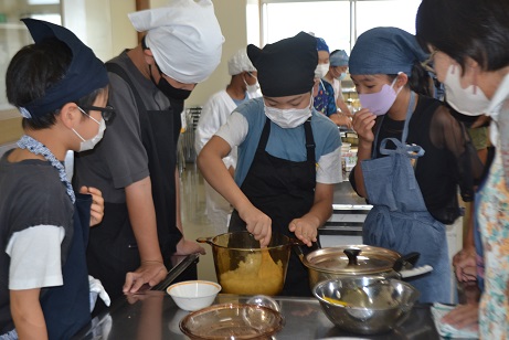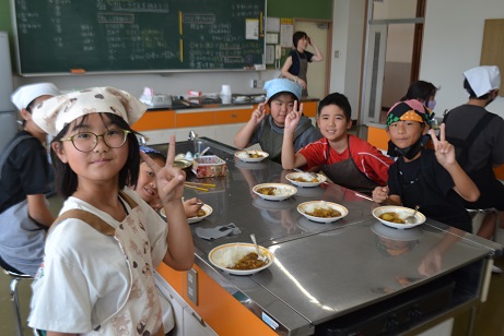 今日は、5年1組がカレーライス作りをしました。みんなで声を掛け合い、助け合いながら作業する姿が見られました。食べた感想を聞くと「おいしかった!」と元気に教えてくれました。今週はいよいよ野外活動です。野外活動でも、おいしいカレーライスとよい思い出ができるといいですね。