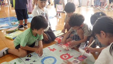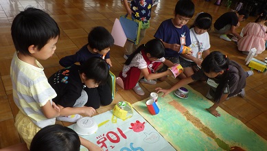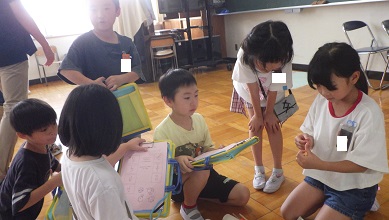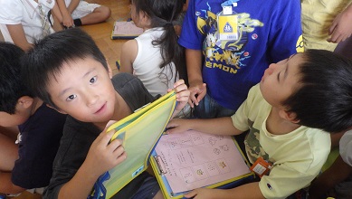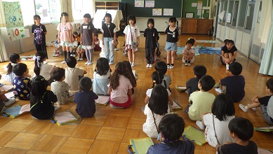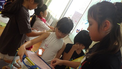生活科「おもちゃランド」を開催しました。お店屋さん、案内人にわかれ、1年生とおもちゃランドを楽しむことができました。「きずな班で活動しているから、もう顔は、バッチリ覚えてる!」と意気込んでいました。「練習は、緊張したけど、本番は自分も楽しめた」「1年生楽しそうだった。自分もハッピー」「2年生のおもちゃ、すごいおもしろい。これは、ユーモアだ」「チームワークよく回れたから、全部のおもちゃで遊べた」と、たくさんのつよみパワーと使って、楽しむことができました。
