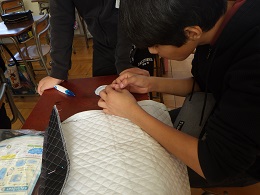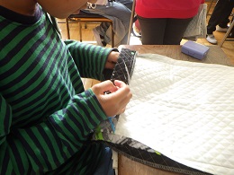 ナップサック作りをしています。ミシン縫いの前にはまち針で止め、しつけ縫いをしてから作業しています。針に糸を通すことに苦戦している子も多く一生懸命に取り組んでいます。針にミシンにアイロンに初めて扱う子もいるので、安全に作業を進め完成まで頑張ってほしいです。お家でも、小物作りなどに取り組んで裁縫に慣れていけるといいですね!