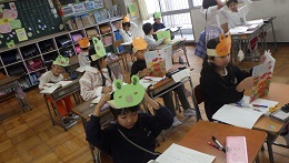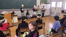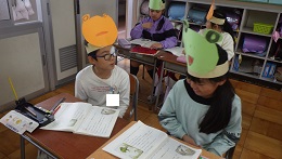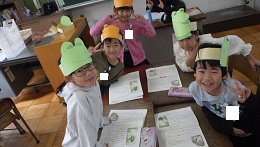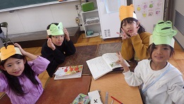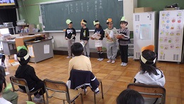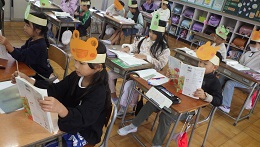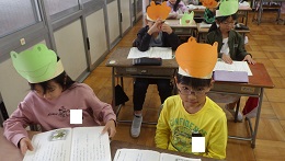 国語科「お手紙」の音読発表会をしています。普段の音読の練習の成果が、発揮されています。「チームワークを使って音読しよう」「ユーモアを使って、かえるくんとがまくんになりきろう」「心の声を想像して音読しよう」とめあてをもって、音読をしています。素敵なお面が自慢です。