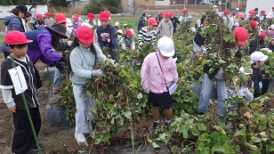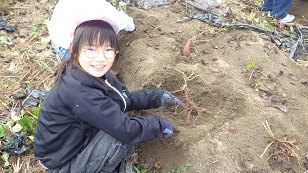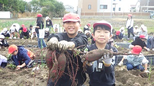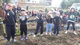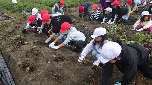 11月4日(火)学校近くの畑にサツマイモ堀りにでかけました。2年生と4年生のきずな班に分かれて、各班に割り当てられた場所でさつまいものツルを取り除き、協力して収穫しました。土の中の赤いさつまいもを見つけると歓声があがり、2年生と4年生が楽しそうに掘り出す姿が印象的でした。収穫したサツマイモは2年生と4年生で持ち帰り、さつまいものツルは後日2年生がリースづくりをするとのことでした。みんながケガ無く楽しく収穫出来てよかったです。