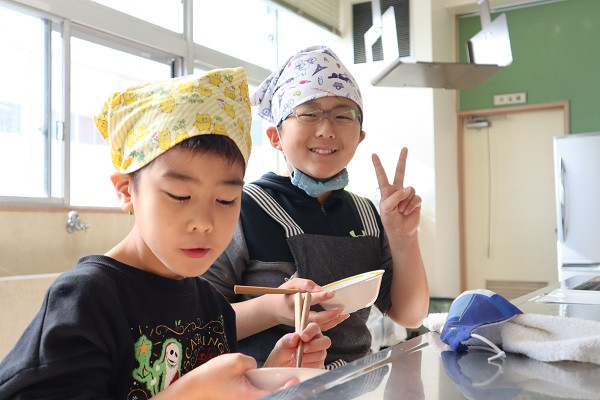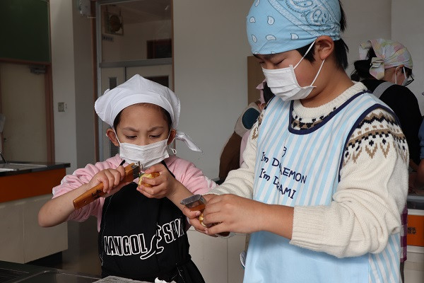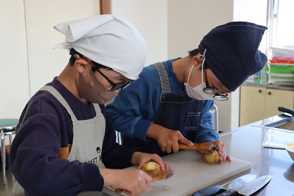 12月4日に収穫したじゃがいもを使って、ジャーマンポテトを作りました。皮むき器を初めて使う子もいましたが、次第に使い方が上手になっていきました。皮むき器や包丁で指を切らないように気を付けて使うことができました。味付けは塩とこしょうのみのシンプルなものでしたが、子どもたちはみんな「おいしい!」と笑顔で食べていました。「家でも作りたい!」と言ってレシピを持ち帰った子もいます。みんなで育てた食材の味は最高でしたね。