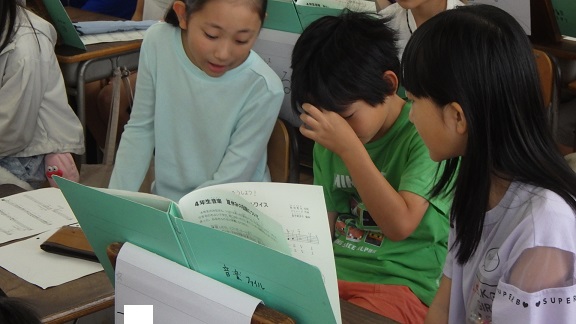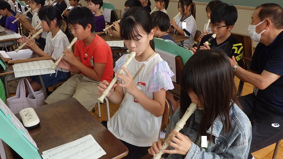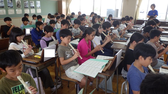 音楽の授業で、3年生と4年生が「勇気100パーセント」のリコーダー練習をしました。初めはお互いに緊張していたようでしたが、校歌を一緒に歌って打ち解けることができたようです。高い「ミ」の音の出し方を教えたり、サビの部分を中心に4年生がリコーダー吹き方を3年生に教えたりすることができました。みんなで楽しく学習することができました。